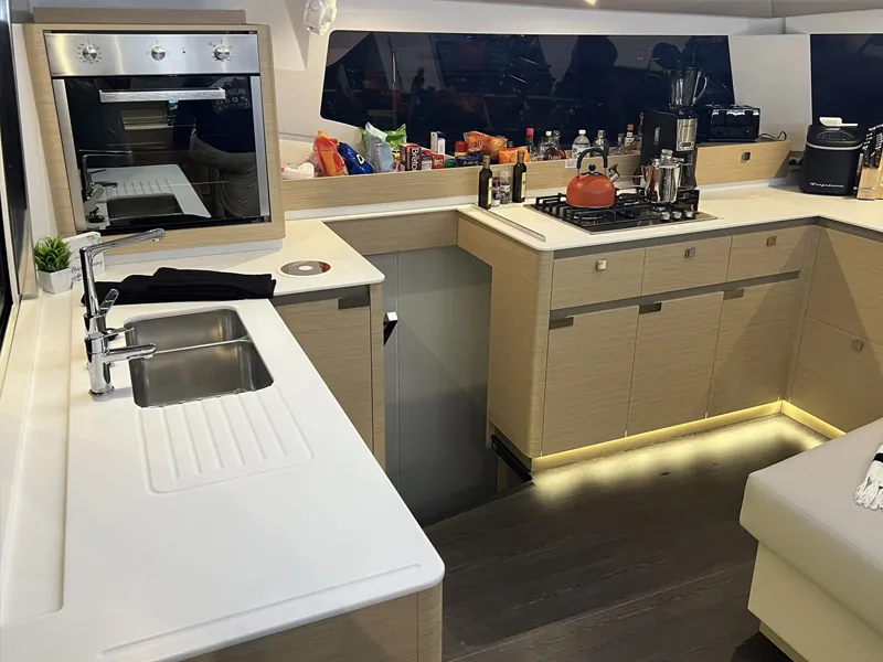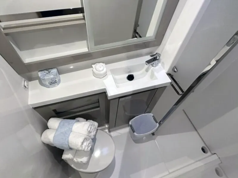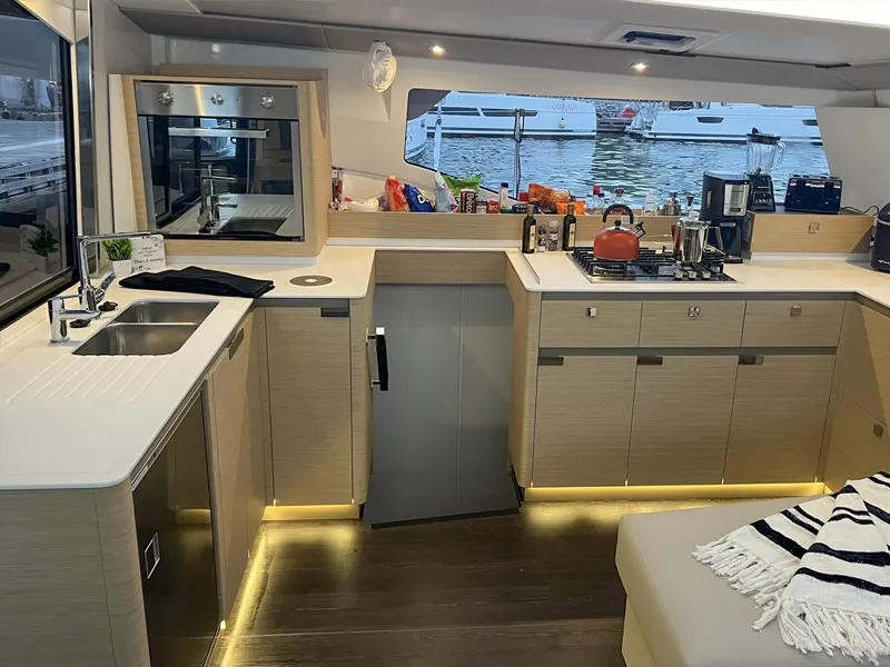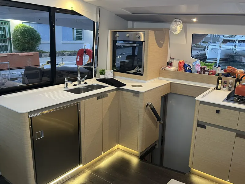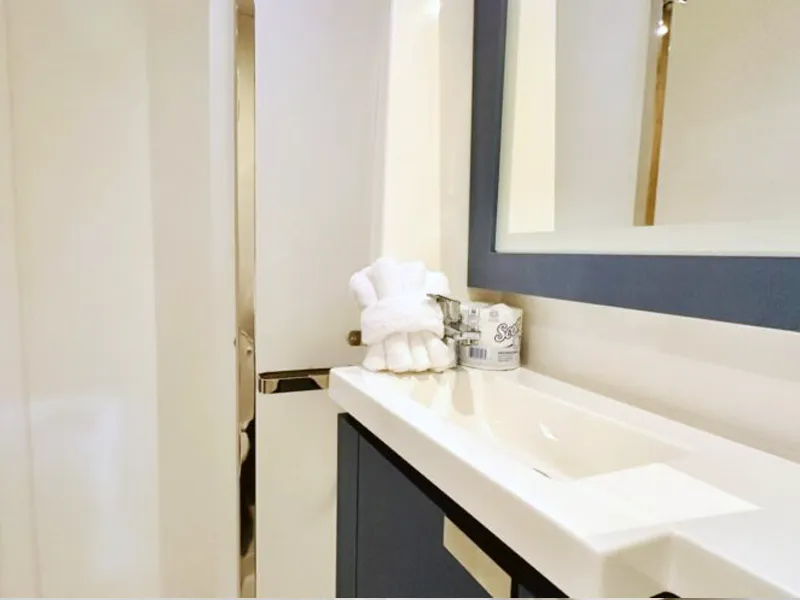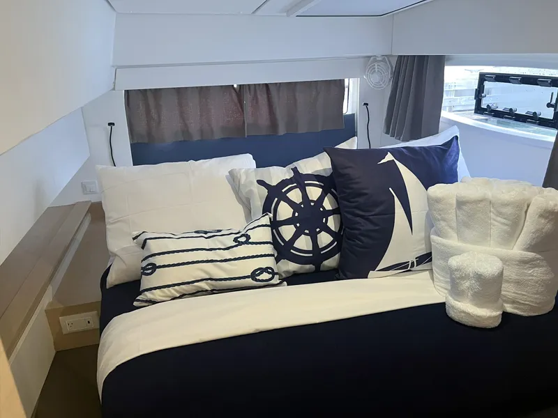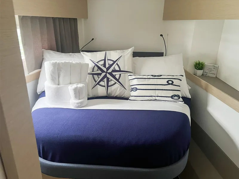 Each hull below deck mirrors the other, with double guest cabins located fore and aft. The spacious cabins include beds with gel mattress toppers, an en-suite head and separate shower for the ultimate in comfort and privacy.