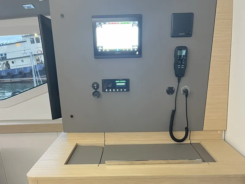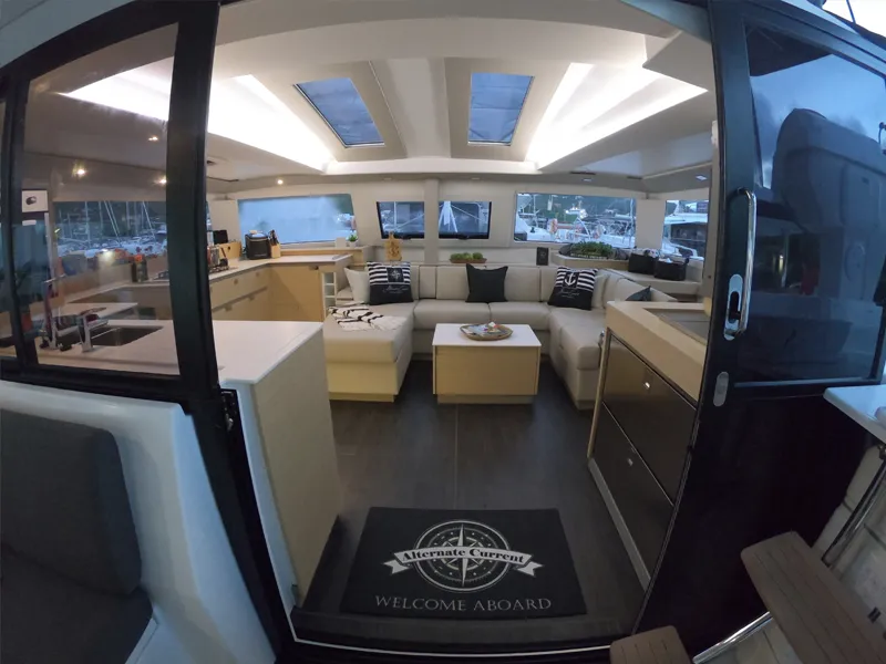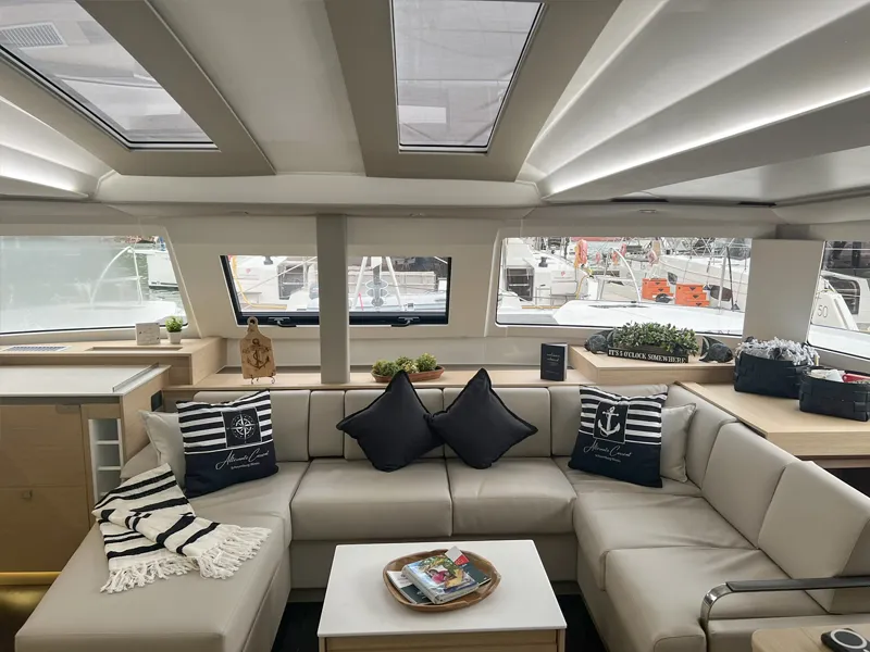 The salon is bright, open and spacious. Visibility is excellent in all directions, thanks to oversized windows, with the center forward window opening outward to let in the breeze. Skylights overhead provide a clear view of the sails, and there is a low coffee table that slides open with ample storage. A large sliding door and sliding windows extends the living space into the cockpit, which includes a dining table and chaise lounge and there is a hot / cold showerhead on the port stern.